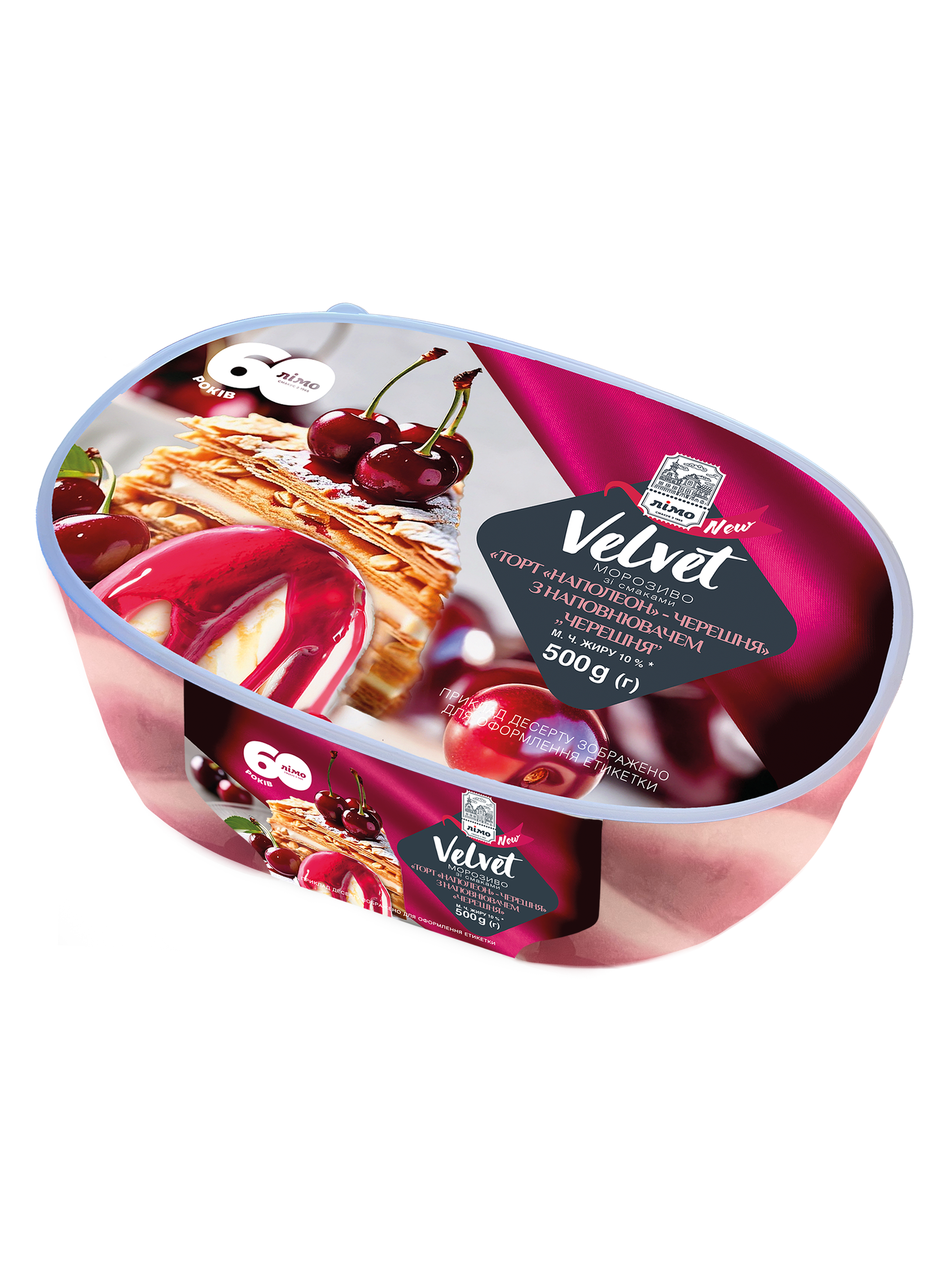Dwuwarstwowe lody, które idealnie łączą deserowy smak lodów z smakiem tortu „Napoleon” i lodów o smaku letnich, soczystych wiśni